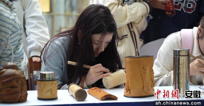 中新网安徽新闻11月4日电 11月2日,徽州区“创意年味会客厅”亮相安徽大学国际文化节,通过“展演+体验”的立体玩法,把黄山毛峰、徽州竹雕、鱼灯、徽剧等徽州非遗和民俗“打包”带到了师生面前。