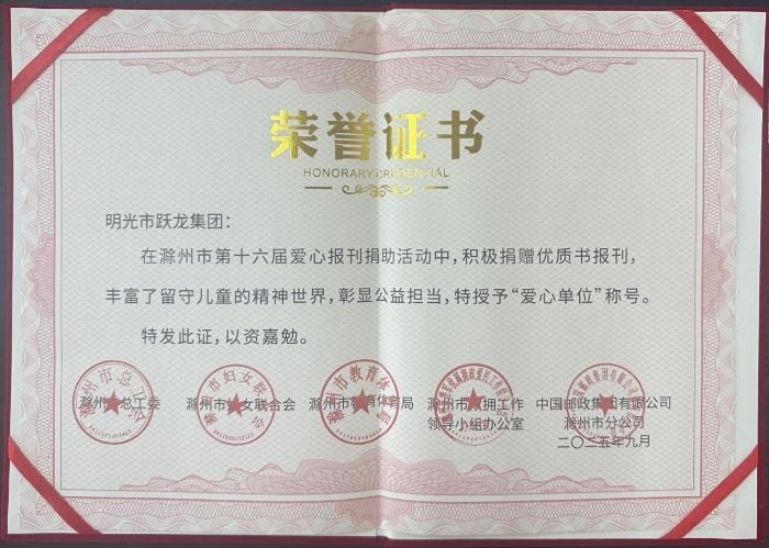 中新网安徽新闻12月9日电 (周晓星)近日,滁州市第十六届爱心报刊捐助活动落下帷幕。明光跃龙投资控股集团有限公司(下称“明光市跃龙集团”)积极响应公益号召,捐赠优质书报刊,被滁州市总工会、滁州市妇女联合会等多家单位联合授予“爱心单位”荣誉称号。
