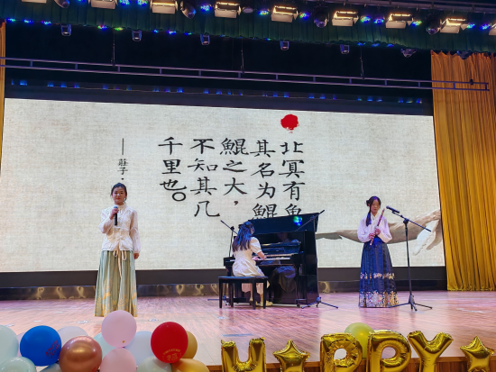 古筝独奏《草原英雄小姐妹》、中国舞《怎叹》、二胡与小提琴合奏《兰亭序》、钢琴与竹笛合奏《大鱼》等节目相继登场,传统与现代艺术形式交织,彰显了学校美育教育的多元融合。相声《说成语》、青春话剧社改编的《新愚公移山》等语言类节目,则展现了学子们的创意与幽默。