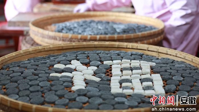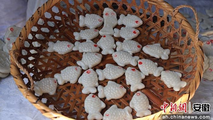 在昌溪村,村民吴奇香正和邻居姐妹们忙着制作徽州米粿。浸泡好的籼米磨成粉后,开水一烫、巧手翻揉,抓起米团往雕花模具里一按,再“啪”地磕出来,寓意“年年有余”的鱼形米粿就成型了。