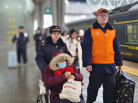 候车室服务台前,要去徐州的王女士搀扶拄着助行器的母亲,同时又携带大件行李,一度非常焦虑。“没想到,工作人员发现后主动帮我们推来了轮椅,还一路绿灯送进站,真是太感谢了!”开车前,王女士挥手向工作人员感谢道别。服务品牌领衔人秦满星介绍说,车站通过12306预约与现场登记,为雪天出行的老年、伤病等重点旅客提供“接力式”帮扶,确保他们雪天出行无忧。