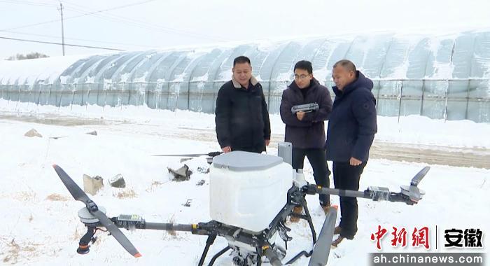 在萧县尚俊家庭农场果蔬种植基地,降雪后,连片大棚被积雪覆盖,部分棚体面临坍塌风险。为确保大棚安全、保障蔬菜按时上市,当地农技部门调集无人机,对大棚喷洒融雪剂。经过一个小时的飞行作业,大棚积雪状况得到有效缓解。