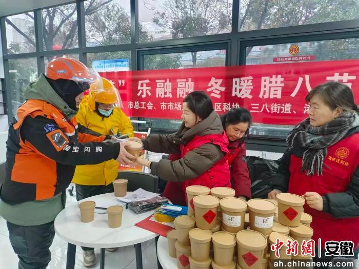 中新网安徽新闻1月27日电 (张欣欣)1月26日,农历腊八节,埇桥区三八街道港利社区在云集商业圈工会驿站举办了一场腊八节活动,为往来奔忙的快递员、外卖骑手、网约车司机等新就业形态劳动者送上关怀。