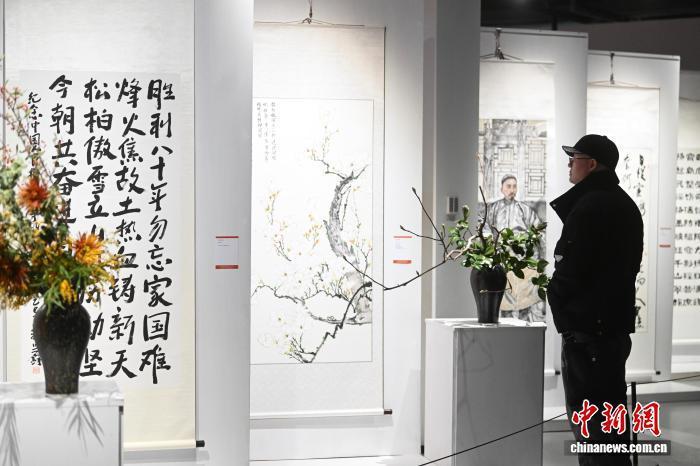 1月28日,“台湾光复80周年纪念展暨两岸跨领域艺术展”在合肥开展。图为台胞在展品前驻足。中新社记者韩苏原 摄