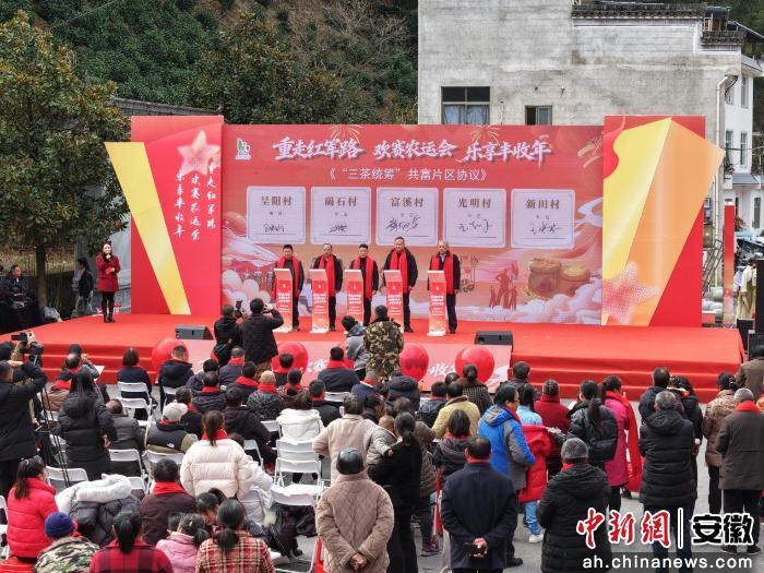 开幕式上,全茶宴、黄山毛峰舞台剧、特色徒步路线三款文旅新品正式发布;全乡五个村的党组织书记共同签订《“三茶统筹”共富片区协议》;黄山市徽州区云上茶乡文旅发展有限公司宣布成立并举行共富联盟揭牌仪式,为推动乡村共富搭建了坚实平台。