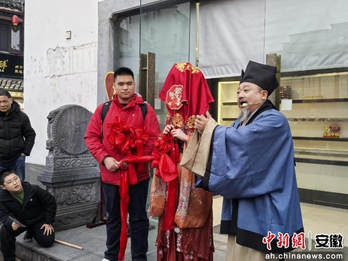 中新网安徽新闻2月19日电 (方晓坚 姚小蝶)春节期间,黄山市屯溪老街推出沉浸式新春演艺活动,以古街为舞台、非遗为底色,融合民俗展演、情景演绎与非遗互动,让市民游客沉浸式体验徽州年俗,感受千年老街的新春活力。
