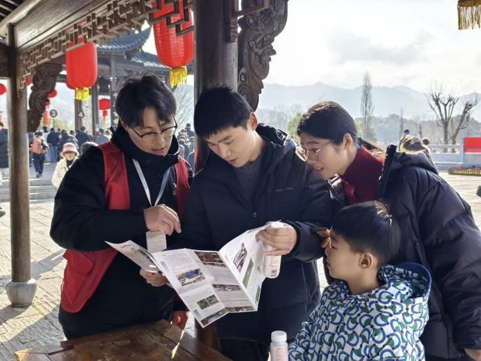 在景区入口、南湖月沼等人流密集处,“红马甲”志愿者们耐心解答游客关于游览路线、票务信息、民宿餐饮等问题,主动为老人、儿童及行动不便者提供帮助。