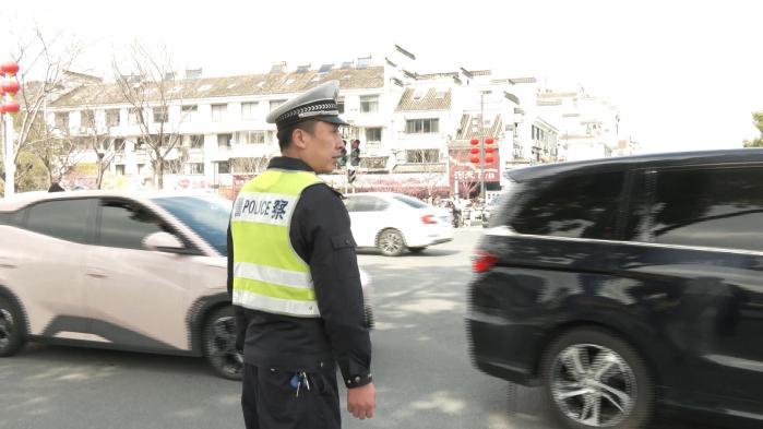 正午时分,徽州古城游人如织,车流不息。执勤交警坚守岗位,在主要路口疏导交通,引导车辆有序通行,全力缓解人流高峰带来的通行压力,保障游客出行安全顺畅。