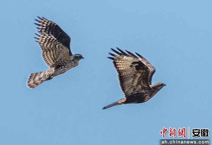 中新网安徽新闻3月17日电 (程启群 黄烈强)近日,黄山市祁门县平里镇有野生动物摄影爱好者捕捉到珍稀画面——苍鹰与普通鵟在空中同框翱翔。据了解,这是该地区首次记录到苍鹰这一物种。