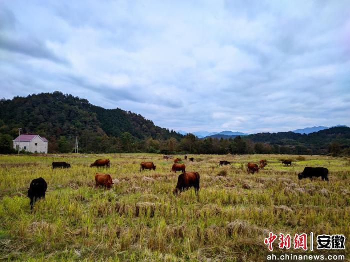 中新网安徽新闻11月7日电 (吴忌)深秋时节,在宣城市旌德县兴隆镇三山村一片收割后的稻田里,脱贫户洪荷月手持细竹鞭,正赶着他的25头黄牛悠然前行。牛群低头啃食田间鲜嫩的野草,与远处的青山、近处的稻茬相映成趣,勾勒出一幅鲜活灵动的田园牧歌图景。
