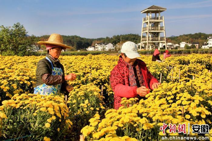 中新网安徽新闻11月19日电 (曹集林 孙永华)时下,正值陶菊、金丝皇菊盛花期。走进休宁县海阳镇盐铺村,菊田里处处是菊农们忙碌采收的身影。强寒潮天气给菊花采收工作带来一定影响,广大菊农正组织人力抢收烘制菊花,促进增产增收。