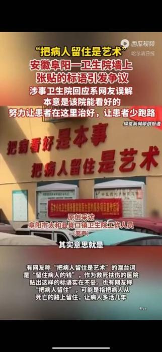 太和县因“医疗”“医药”闻名全国,这个标语因此更耐人寻味。有网友质疑其暗含“留住病人多赚钱财”的逐利潜台词,但也有网友尝试将其解读为“挽救危重患者”的正面含义。据媒体公开报道,卫生院工作人员回应称,标语本意是“让患者就近就医、少跑路”,并表示会向领导汇报相关情况。