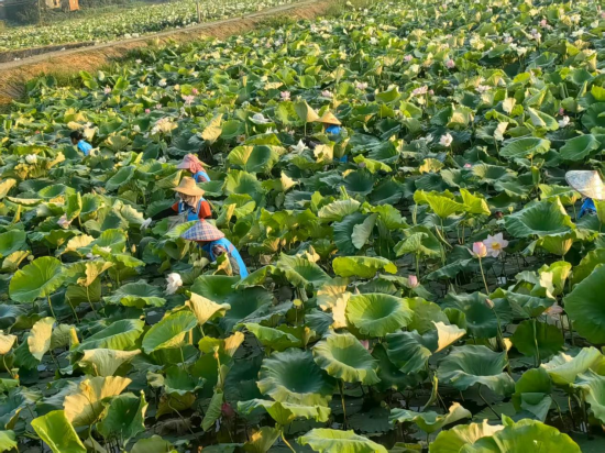 白桥镇立足水土资源优势,创新“村集体+企业+农户”发展模式,整合600亩坑塘水面,撬动社会资本与衔接资金共550万元,打造现代化莲子种植基地,种植莲子500亩、水生蔬菜100亩。借助合作企业的技术与市场资源,引入18台现代化加工设备,与3家企业建立稳定合作,预计莲子年产值达400万元,年纯收益30万元。此外,社区还发展120亩水蛭养殖基地、300亩金银花种植基地,累计带动近50户农户稳定就业,实现集体经济与农户收入双提升。