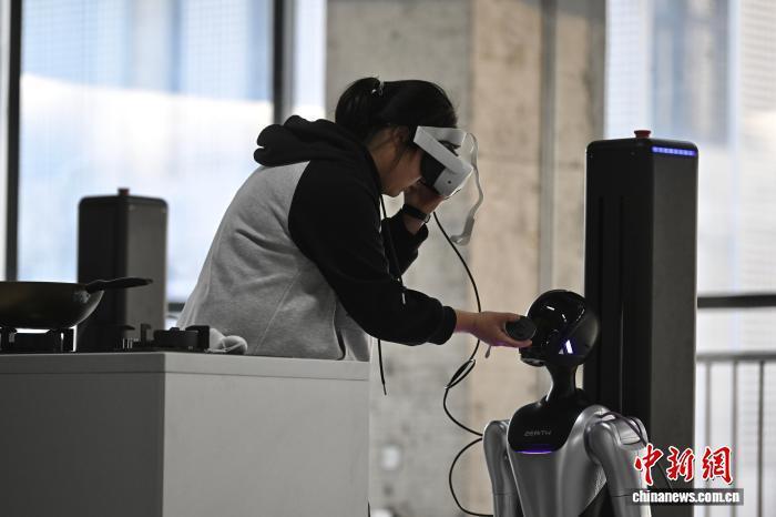 1月8日,在安徽合肥零次方机器人数据采集中心,身为“老师”的机器人数据采集员带领机器人“学生”进行场景实操训练。中新社记者韩苏原 摄