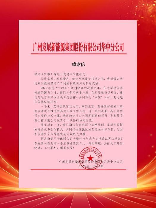 图为广州发展新能源集团股份有限公司华中分公司感谢信。