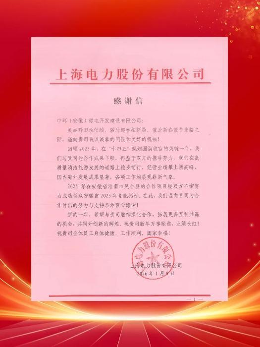 中新网安徽新闻1月23日电 近日,中环新能源控股集团旗下中环(安徽)绿电开发建设有限公司(以下简称“中环绿电”)收到来自国家电投上海电力股份有限公司、广州发展新能源集团股份有限公司华中分公司发来的感谢信。这既是对中环绿电项目团队工作的充分肯定,也彰显了公司在新能源领域的资源整合能力与专业技术水平。