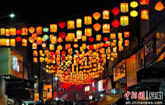 中新网安徽新闻2月8日电(吴玉洁 谷庆江)2月7日晚,安徽省黄山市休宁县五城镇集镇街道灯火通明,春节氛围日益浓厚。
