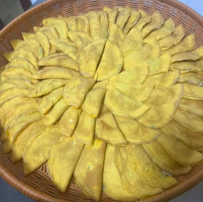 包粽余温未散,做蛋饺的热闹已然铺开。金黄蛋皮在铜勺里转成“金元宝”,既是“招财进宝”的好兆头,也是年夜饭必备风味。村民们围炉轮流上手,舀蛋液快速转动,一张薄如蝉翼的蛋皮便成型。“蛋饺要皮薄馅足、火候精准。”有经验的村民边填馅边传授技巧,指尖捏合间,饱满蛋饺新鲜出炉。