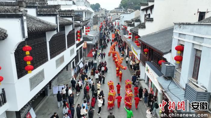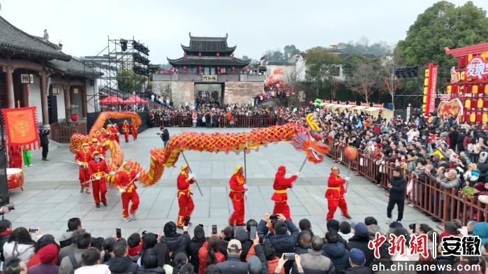中新网安徽新闻2月17日电 (凌利兵 吴灿)17日,歙县的大街小巷张灯结彩、锣鼓喧天。当地民众用舞布龙、划花船等传统民俗,热热闹闹欢度新春佳节。游客和市民赏民俗、逛市集,浓浓的年味儿扑面而来。