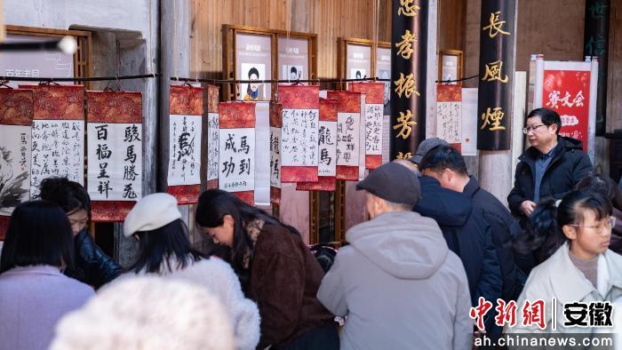 洪家大屋正厅内,“新春赛文会”重现了古代文人的风雅情境。游客或围绕马年主题即兴创作诗文,提笔写下新年祝福,或亲手体验竹编技艺,在笔墨与指尖的流转间,触摸徽州深厚的文化底蕴。