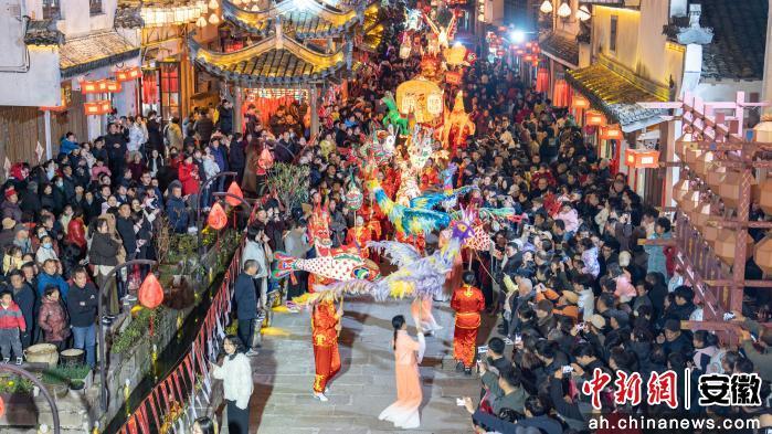 中新网安徽新闻3月5日电 (宋诚钊)正月十四至十五,宏村镇宏村、雉山、屏山三村联动,轮番上演了一场精彩纷呈的民俗文化表演。宏村花灯巡游、雉山凤舞、屏山长宁社鼓、金家岭舞麒麟等相继登场。