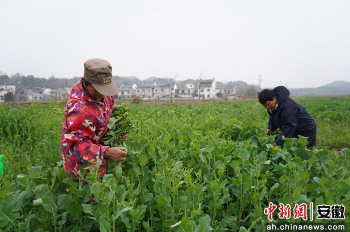 中新网安徽新闻3月5日电 (任俊翔 邹雅卉)眼下正值春菜上市时节,在黄山奕丰农业科技有限公司的示范基地里,成片的油菜薹鲜嫩翠绿、长势喜人。村民们穿梭其间,忙着采收、搬运,一派忙碌景象。