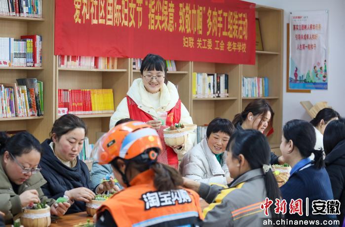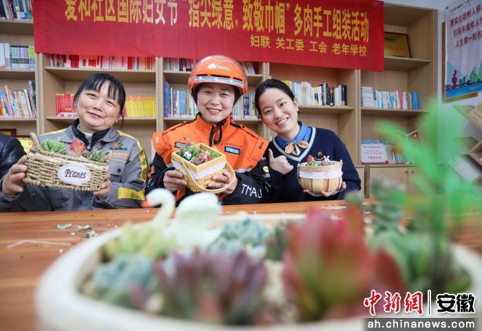 中新网安徽新闻3月6日电(陈家乐)3月6日,在安徽省合肥市肥西县上派镇爱和社区“指尖绿意致敬巾帼”活动中,当地志愿者和女性居民一起制作多肉盆栽。近期,为迎接2026年“三八”国际妇女节到来,上派镇组织辖区内的外卖员、收银员、保洁员等多种职业女性居民,共同开展多彩活动。