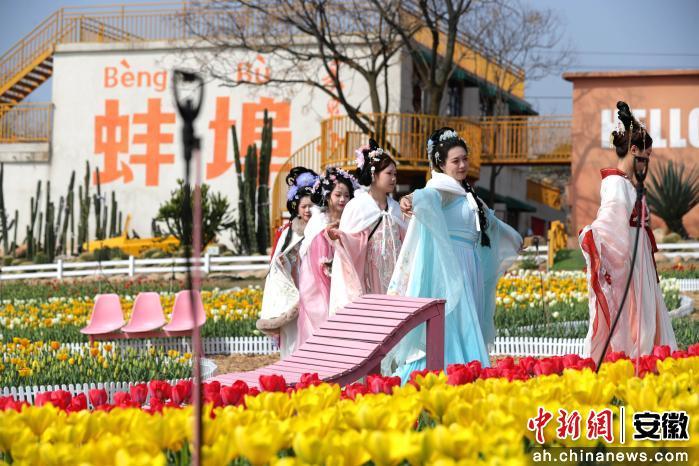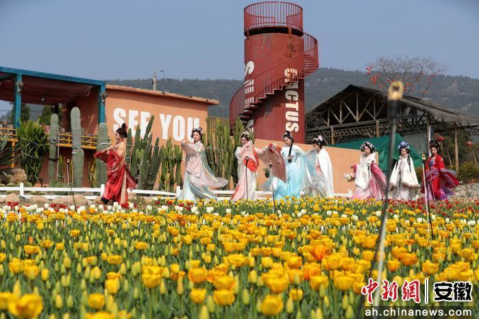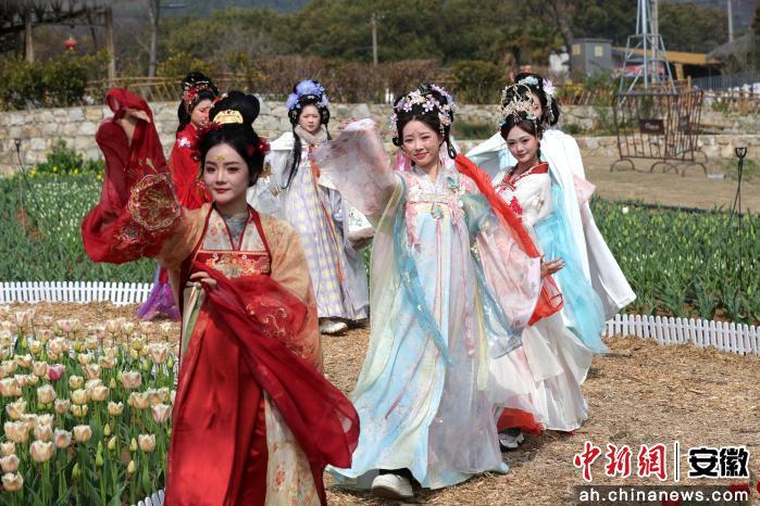 近日,安徽省蚌埠市禹会区禾泉小镇景区内的30万株郁金香花开,周边的市民游客趁着周末春光,穿梭在花海与“花仙子”之间,驻足观赏、拍照留念。图为3月22日,景区内,身穿汉服古装的“花仙子”们在进行巡游表演。李斌 摄