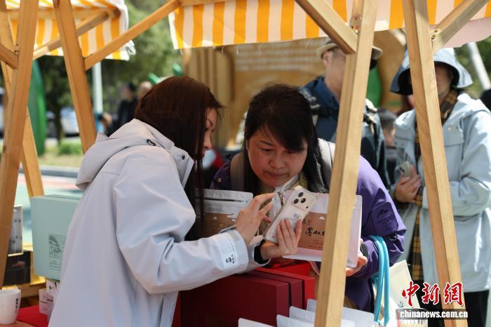3月28日,游客在黄山市徽州区茶叶市集咨询黄山毛峰新品信息。刘鸿鹤 摄