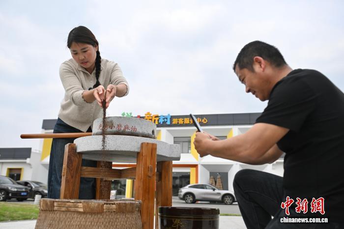 4月15日,在位于安徽省定远县池河镇岱山新村,村民代帮林和她的爱人一起拍摄在直播预热视频。中新社记者韩苏原 摄